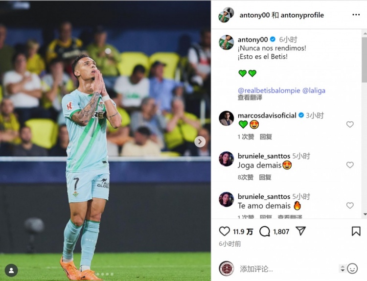 Anthony đã đăng một bức ảnh ăn mừng bàn thắng của anh ấy lên mạng xã hội với dòng chữ: "Chúng tôi sẽ không bao giờ bỏ cuộc, đây là Betis!"
