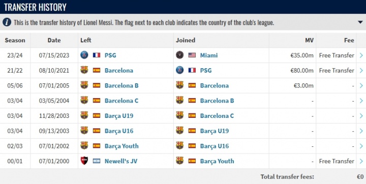 Messi đã chơi cho 3 câu lạc bộ: Barcelona, Paris và Inter Miami trong sự nghiệp của mình. Trong hai lần chuyển nhượng của mình, Messi rời đội theo dạng tự do mà không mất phí chuyển nhượng. Trên trang chuyển nhượng Đức của Messi, tổng phí chuyển nhượng lịch sử trong sự nghiệp của anh được hiển thị rõ ràng là 0.
