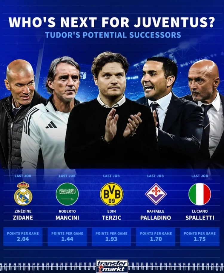 Hôm nay, Câu lạc bộ Juventus đã chính thức thông báo rằng họ đã sa thải huấn luyện viên 47 tuổi Tudor. "Thị trường chuyển nhượng" cũng dự đoán một số ứng cử viên nổi tiếng cho vị trí huấn luyện viên mới của Juventus, đồng thời liệt kê đội ngũ huấn luyện cuối cùng và điểm trung bình mỗi trận của họ.